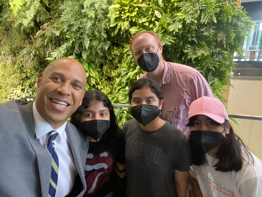 Yurai Gutierrez Morales is in the center, Diana Gutierrez Morales is next to Senator Cory Booker, and Mark Eastburn appears in the back.